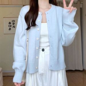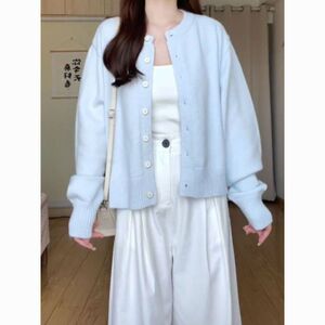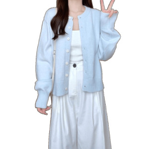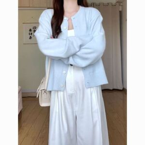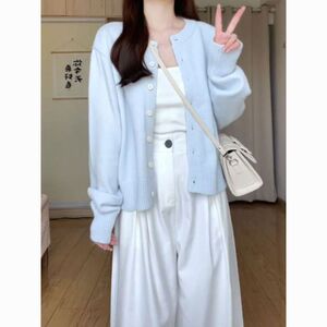 软糯浅蓝色针织衫毛衣女装外套春秋冬季新款简约短款外穿开衫上衣