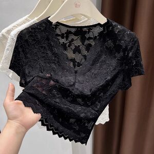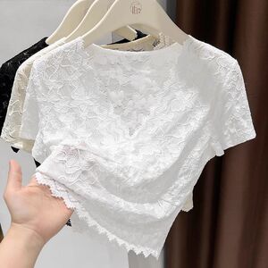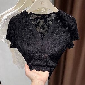 アイスシルクメッシュレース半袖Tシャツレディース夏新作ピュアデザイア甘辛Vネックスリムフィットインナーショートトップ