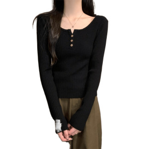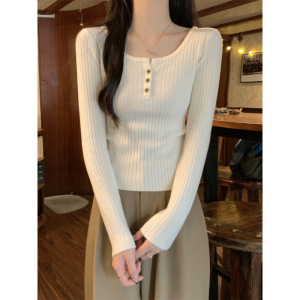 法式方领针织毛衣漏锁骨打底衫女2025春季肌理感修身纽扣长袖上衣