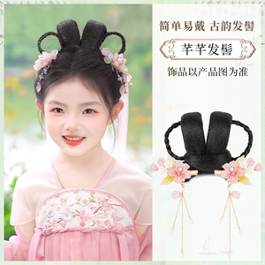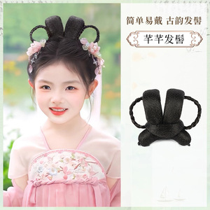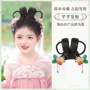 子供用漢服ウィッグ、ヘアバッグ、古代衣装、女の子ステージパフォーマンス、怠惰なおだんごヘア、古代風ヘアアクセサリー、かわいいスタイル