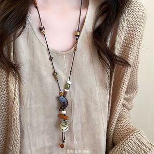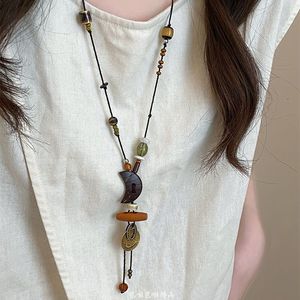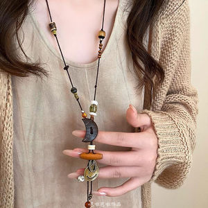 三日月の笑顔の木製陶磁器の編み縄のネックレスの女性の復古的な民族の風の長いタイプの毛の服のチェーンの新しい中国式のアクセサリー
