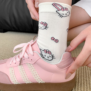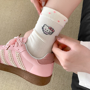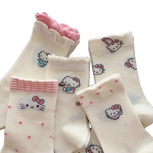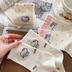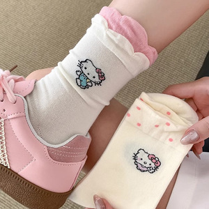 春と夏の甘いキティ猫ソックス女性のミッドカーフソックス春と夏の薄いかわいい漫画ピンクレースパイル