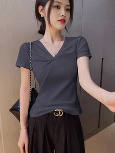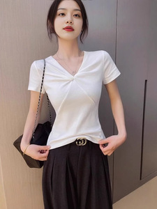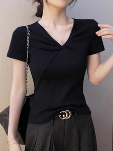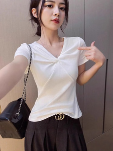 卸売ハイエンドシャツレディースVネック半袖Tシャツ夏純粋な欲望ツイストデザイン右肩スリムフィットトップ