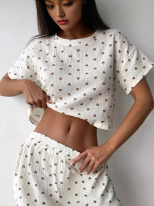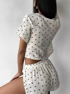 新しいクロスボーダー夏ヨーロッパとアメリカの薄い愛プリントクレープ純綿パジャマ女性の半袖スリットショーツ 2 点セット