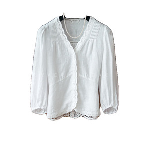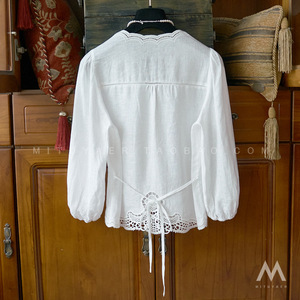 篙度精致 怎么穿都有气质定位镂空刺绣花边V领收腰系带亚麻衬衫