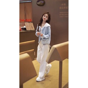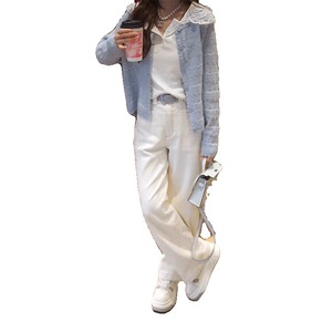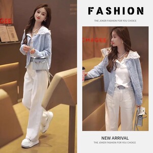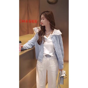 早春套装女2025新款镂空花边开衫气质糖果长袖外套简约长裤三件套