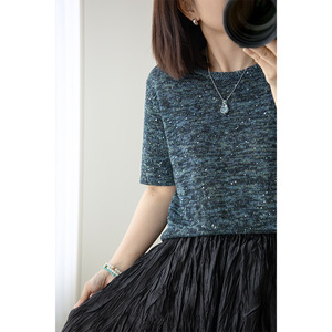 アンナ・ケンケン スターライト ハーバライフ スパンコール フラワー ガーゼ リネン コットン混 ラウンドネック 半袖 ニット Tシャツ