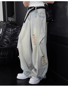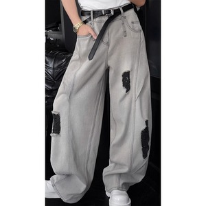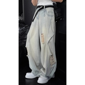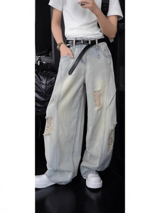 トレンディなリップドウォッシュジーンズメンズ夏薄いルーズファッションアメリカンハイストリートスモールソードパンツ