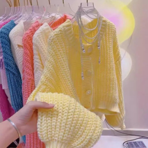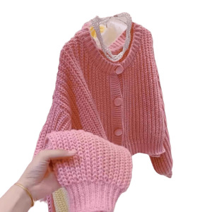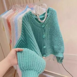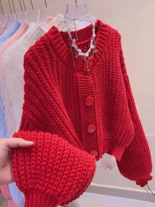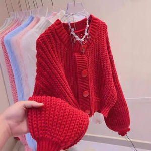 怠惰なキャンディーの赤いセーターのコートの女性の秋の新型のゆったりした洋風の爆発の厚い丸首の短いニットのカーディガン
