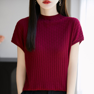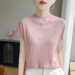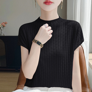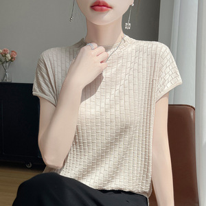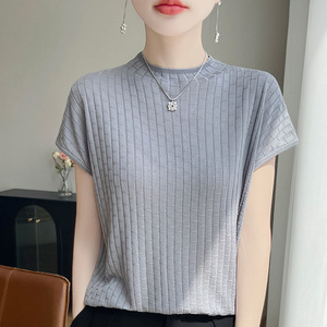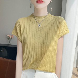 2025 夏の新薄型ラウンドネックテンセルストライプ Tシャツ半袖女性の多用途通気性ニット半袖女性のトップ