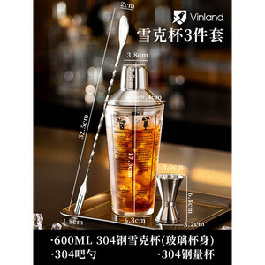 600ml ガラスボディ 304 シェーカーカップ + 304 スチール計量カップ + 304 ロングバースプーン