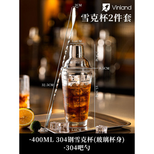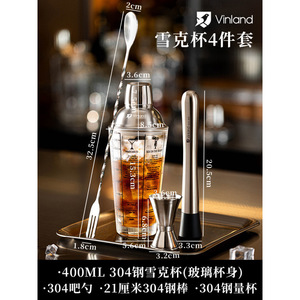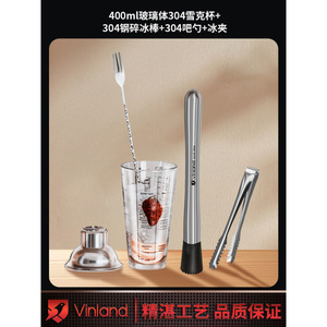 400ml ガラスボディ 304 シェーカーカップ + 21cm 304 スチールロッド + 304 バースプーン + アイスクリップ