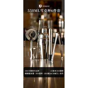 【6点セット】550mlオールスチール304シェーカーカップ+21cm304スチールロッド+304バースプーン+