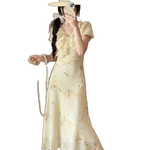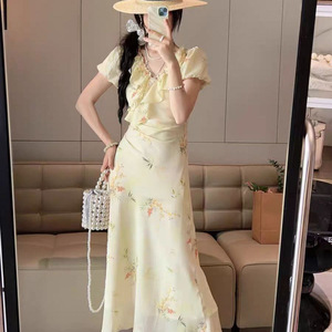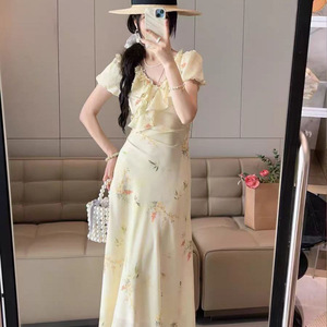 フランスの新しい中国風のレトロな2025プリント花柄ウエストドレス夏の気質ロングスカート