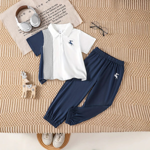ツーピースボーイズシャツ、ヘラジカプリント、コントラストカラーステッチ半袖Tシャツ、春夏用ウエストゴムカジュアルパンツ