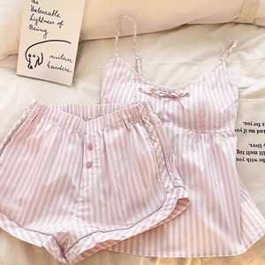 ピンクの甘い女の子ストライプリボンパジャマセット女性の夏胸パッドサスペンダートップショーツホーム服