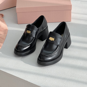 miu新款复古学院风厚底钱币乐福鞋粗跟真皮英伦风百搭小皮鞋女7cm