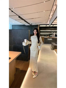 フランスのホットスタイル中空新作ニットカーディガントップかぎ針編みスカートスーツ痩身軽い高級気質ツーピースセット