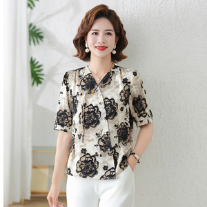 2025年新作夏スタイルスリムママプリントトップス中年女性向けシフォンVネックゆったり大きいサイズシャツ