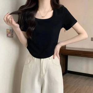 ヨーロッパ糸ラウンドネック半袖Tシャツレディース夏新作鎖骨ユニークでシックなスリムトップ半袖Tシャツイン