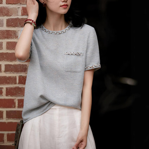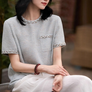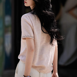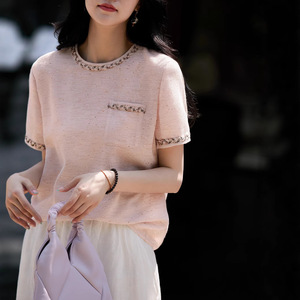 クラウドピンクゴールデンフェザーガーゼ古代織り糸手作りビーズデザインラウンドネック半袖トップ