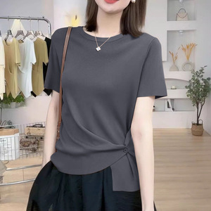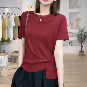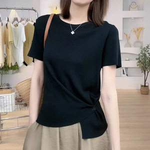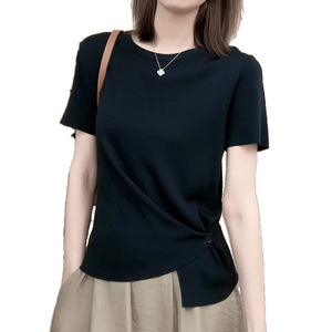 2025 新しい夏のアイスシルク半袖シャツ女性のデザインニッチファッションスリムチョッキラウンドネックオフショルダートップ