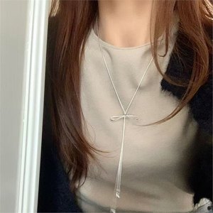 女性用シルバーリボンプルネックレス、シンプルなインコールドスタイルロングアクセサリー、韓国ファッション気質鎖骨チェーン