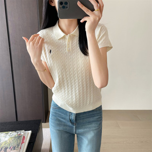 ポニー刺繍入りポロカラーラペルケーブルツイストショートニットセーター半袖Tシャツトップス女性用