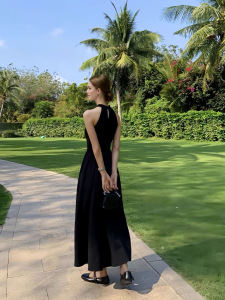 法式优雅黑色挂脖连衣裙女夏季赫本风拼接气质收腰露肩长裙