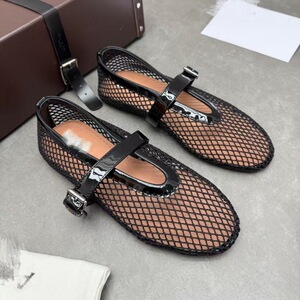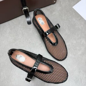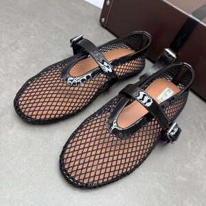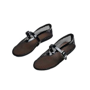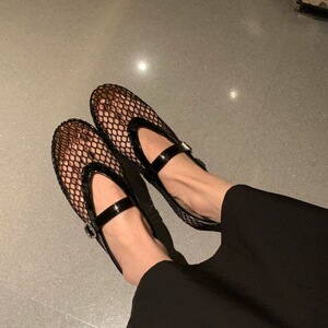 ニッチピュアオリジナルブラック中空メッシュフラットバレエシューズ本革ワンラインバックル網タイツシューズインスタイルメリージェーンシューズ