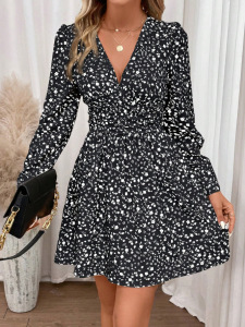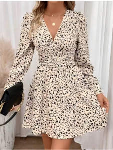 2025年欧米向け新作春秋フレンチ風花柄プリントウエストギャザー長袖ワンピースアマゾンレディース