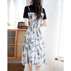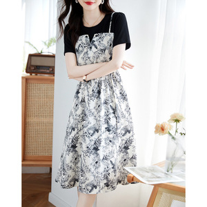カラフルなサスペンダーステッチTシャツドレス夏の新しい気質ウエストコントラストカラーミドル丈ドレス女性用
