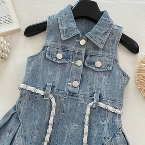 2025夏の女の子の王女のスカートのノースリーブのデニムのワンピースの新型の子供は襟をひっくり返して腰の仕事の服のベストのスカートを収めます。