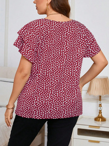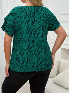 2025年夏 クロスボーダー 大きいサイズ レディース 不規則な水玉模様プリント 蓮の葉袖 スリムフィット ラウンドネック 半袖 エレガント