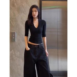 2025 新しい夏の黒の V ネック 5 分袖 T シャツ女性のデザインニッチシックなスリムフィットトップトレンディ
