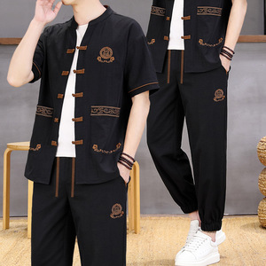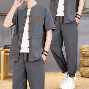 夏のメンズスーツ中国風カジュアルカーディガン半袖エスニックスタイル紳士服漢服レトロ唐スーツツーピーストレンディセット
