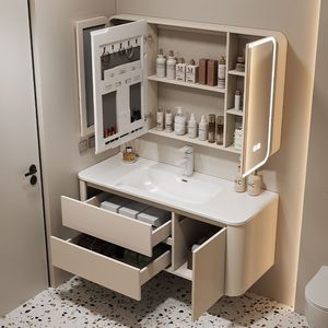 バスルームスマート洗面台キャビネットラウンド無垢材洗面セラミック一体型クリームバスルームキャビネット洗面台の組み合わせ