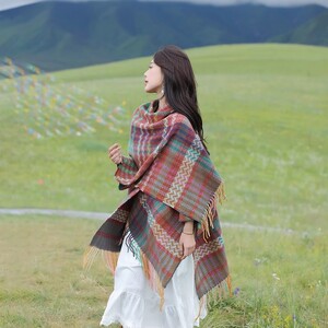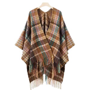 撞色波浪春秋保暖民族风披肩毛毯外搭针织开衫斗篷披风流苏搭肩
