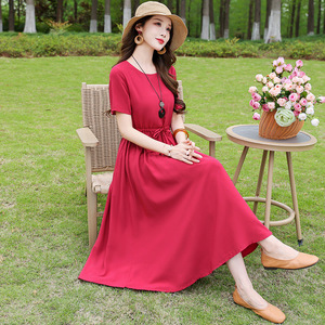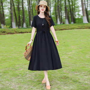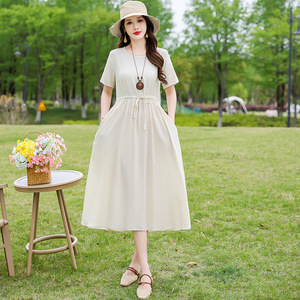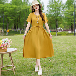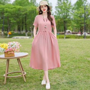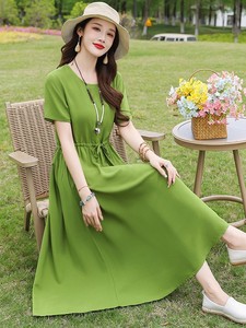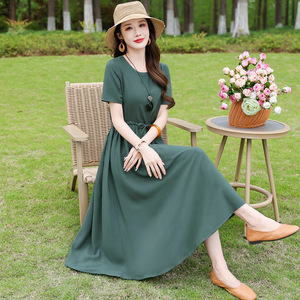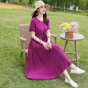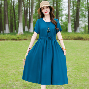 お母さんの端正な大気の夏服の新型の純色の綿のワンピースの中の長い高級な気質は腰を収めてやせているスカートを現します。