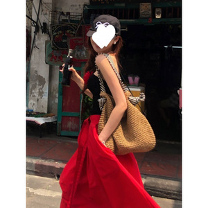 スカートスーツレディースベルベットホルターネックキャミソール赤いリボンリボン大裾スカート夏ツーピースセット