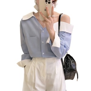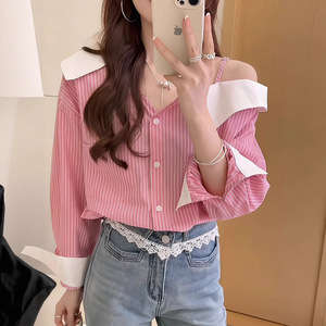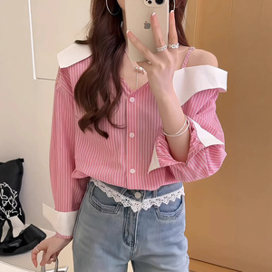 デザインニッチ不規則なワンショルダーサスペンダーストライプシャツ女性のための 2025 春と秋の新しい韓国スタイルの小さなトップ
