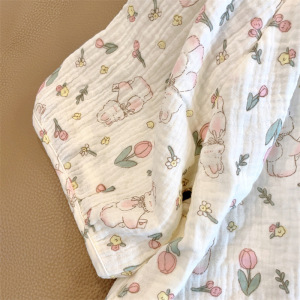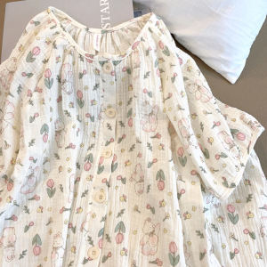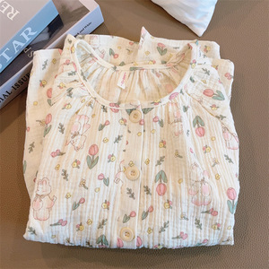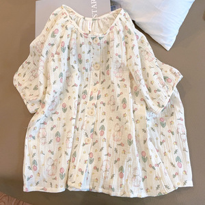 女性のための二層純綿ガーゼパジャマ夏半袖インターネット有名人甘くてかわいいウサギの夏カーディガン薄いホーム服