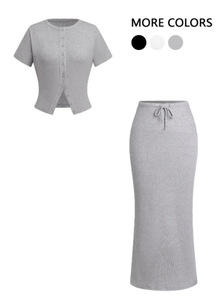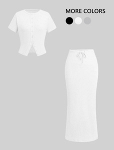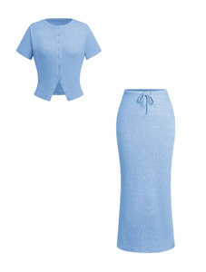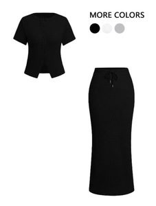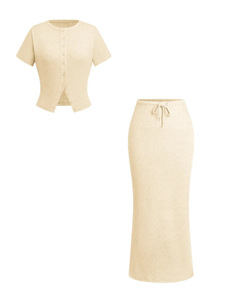 2025年夏 AliExpress Amazon スリムフィットボタン付き半袖ロングスカートスーツ レディース 欧米風ボタン装飾ロングスカート