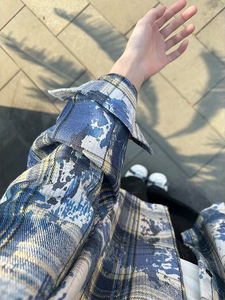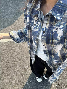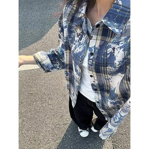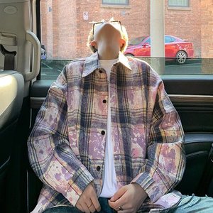 アメリカンレトロタイダイグリーンチェック柄シャツ男性と女性のための春と秋のクリーンフィット起毛ルーズカップルシャツ