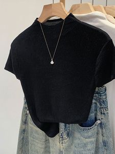 莱赛尔天丝法式蓝色半高领正肩短袖针织衫女2025夏季新款单穿上衣