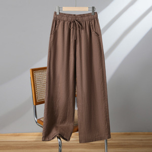 女性用コットンとリネンのワイドレッグパンツ、春、秋、夏、ハイウエスト、大きいサイズのリネン9点パンツ、巾着ストレートレッグの薄手カジュアルパンツ