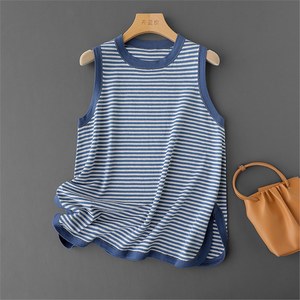 アイランドカントリーRホーム~クラシック青と白のストライプラウンドネックルーズノースリーブベストTシャツレディース夏の新作トップス