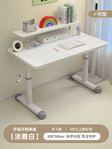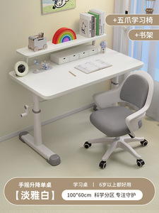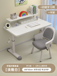 【エレガントホワイトテーブルとチェアセット】100*60ハンドリフトシングルテーブル+本棚+引き出し+昇降可能な4本脚学習椅子