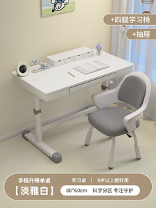 【エレガントホワイトテーブルとチェアセット】80*60ハンドリフトシングルテーブル+引き出し+昇降可能な4本脚スタディチェア