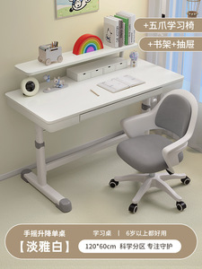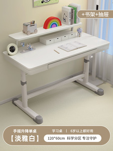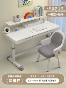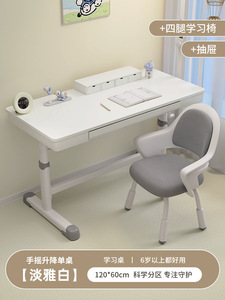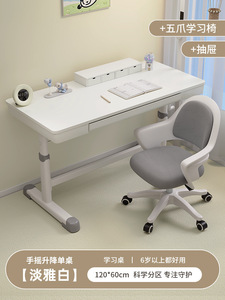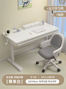 【限定ホワイト無垢材モデル・テーブル&チェアセット】120*60手動昇降シングルテーブル+引き出し+昇降式4本脚学習椅子